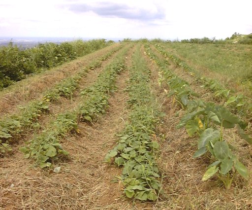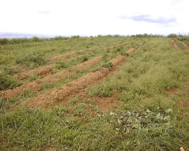 刈払機で除草したサツマイモとサトイモの畑。