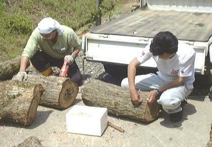 こちらはシイタケのほだ木造り。植菌をしているところ。