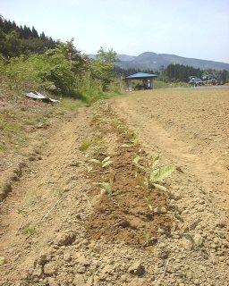 手前はトウモロコシ、向こうはエダマメの追い蒔き。