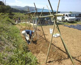 こちらはエンドウ豆の植え付け。奥にはヘチマが植えられた。