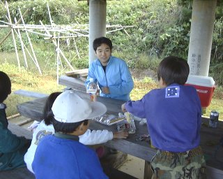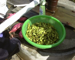 黒大豆やイモを調理していると、遠く関西から匂いを嗅ぎ付けて学生がやって来た!