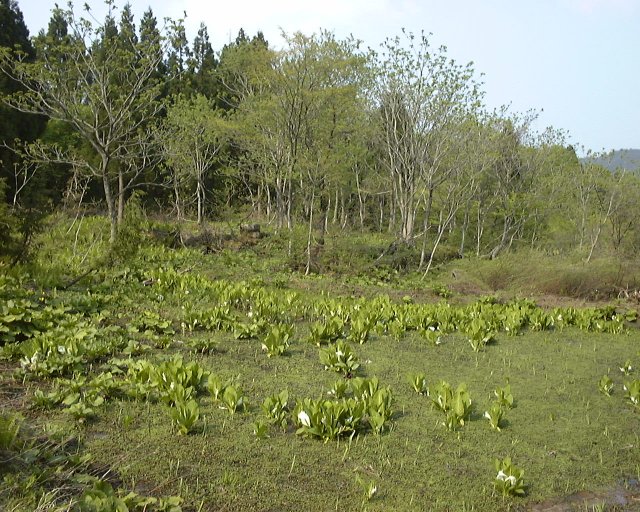 ミズバショウが群生している。