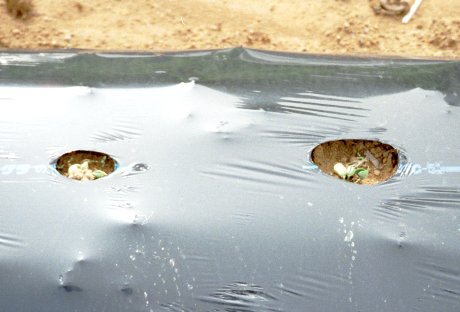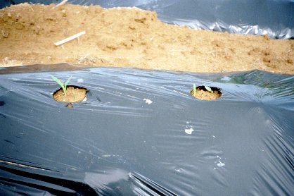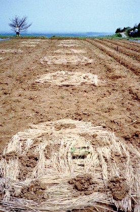 スイカの苗に藁を敷く