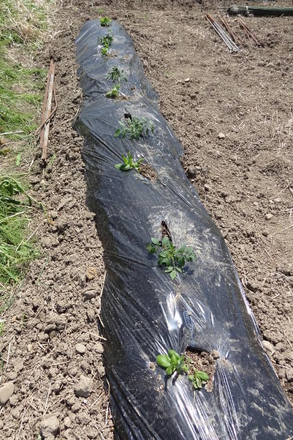 夏野菜苗の定植~1 半農 Twitter Facebook はてブ Pocket LINE コピー 2020.04.21 2018.05.05 夏野菜の植え付けを始めました。写真は手前からピーマン2株、伏見甘長2株、万願寺唐辛子2株、インゲン3株です。来週はまた気温が下がりそうなのでナスやキュウリはまだ植えません。 こちらはトマト。スイートバジルと交互にアイコ(ミニ)、レッドオーレ(中玉)、ファースト(大玉)、シシリアンルージュ(調理用)を1株づつ植えました。 こちらはトウモロコシ(ピーターコーン)とエダマメ(サッポロミドリ)です。