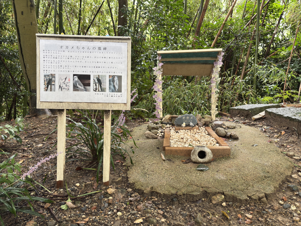 令和2年3月31日、白いオカメインコがカラスに追われて本殿に逃げ込んできました。そのまま保護されて、オカメちゃんと呼ばれ皆に可愛がられたそうです。令和5年10月28日天寿を全うし、ここに葬られました。あれ、神社にお墓って反則では?